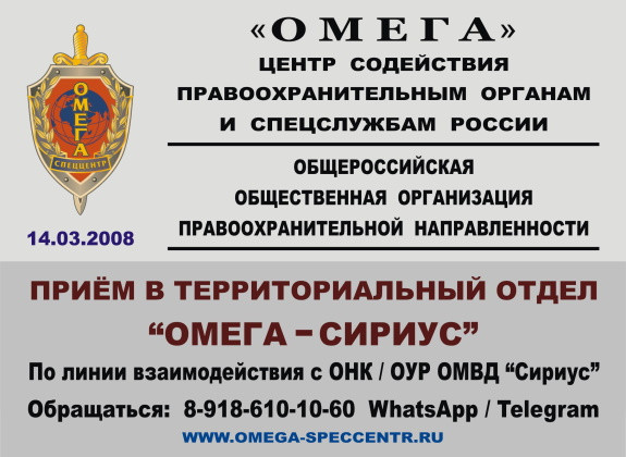 • Также ведётся приём в Территориальный отдел «ОМЕГА-Сириус». Для прямого взаимодействия с сотрудниками ОНК / ОУР ОМВД по ФТ «Сириус» с целью максимально оперативного реагирования по противоправным действиям.